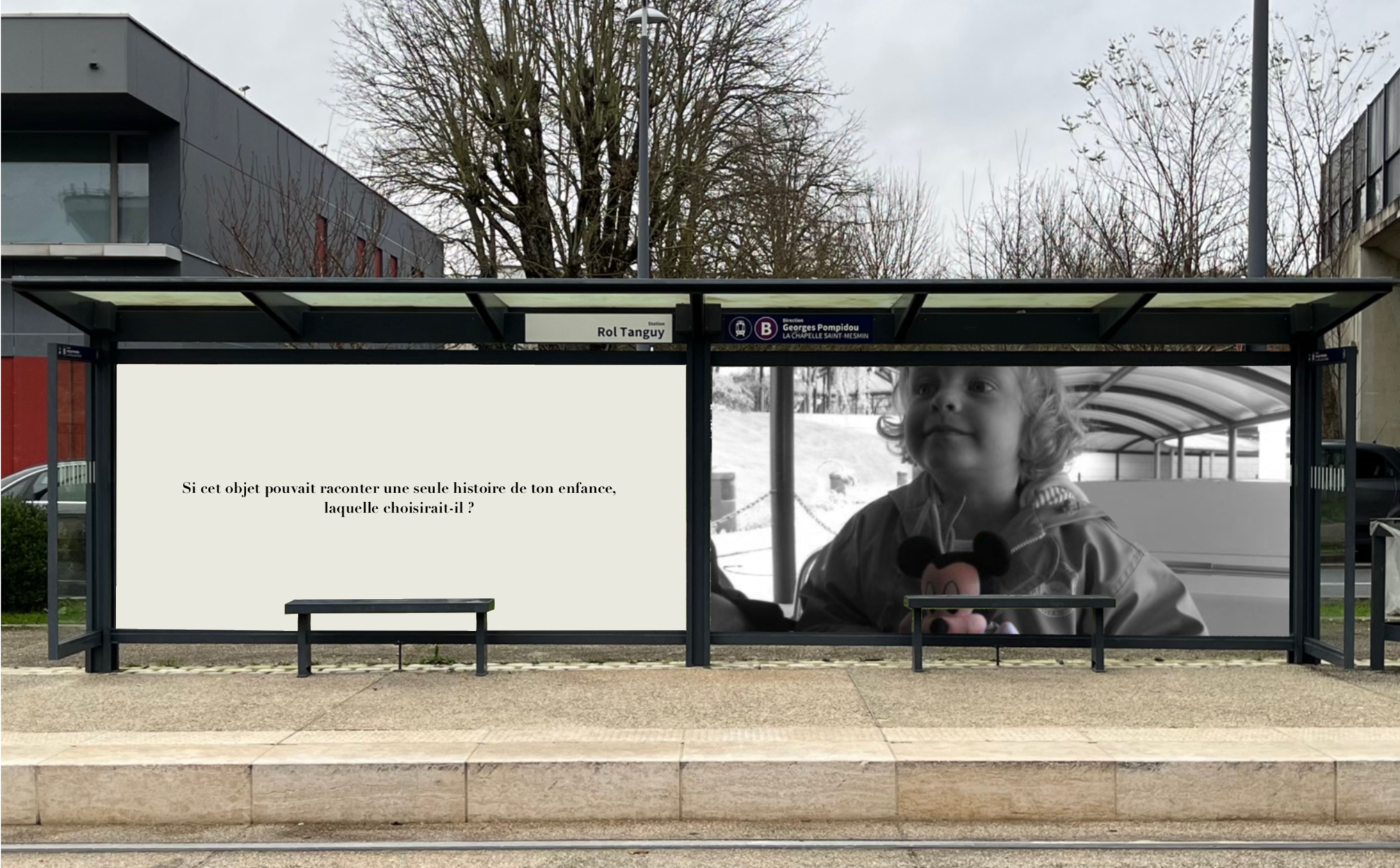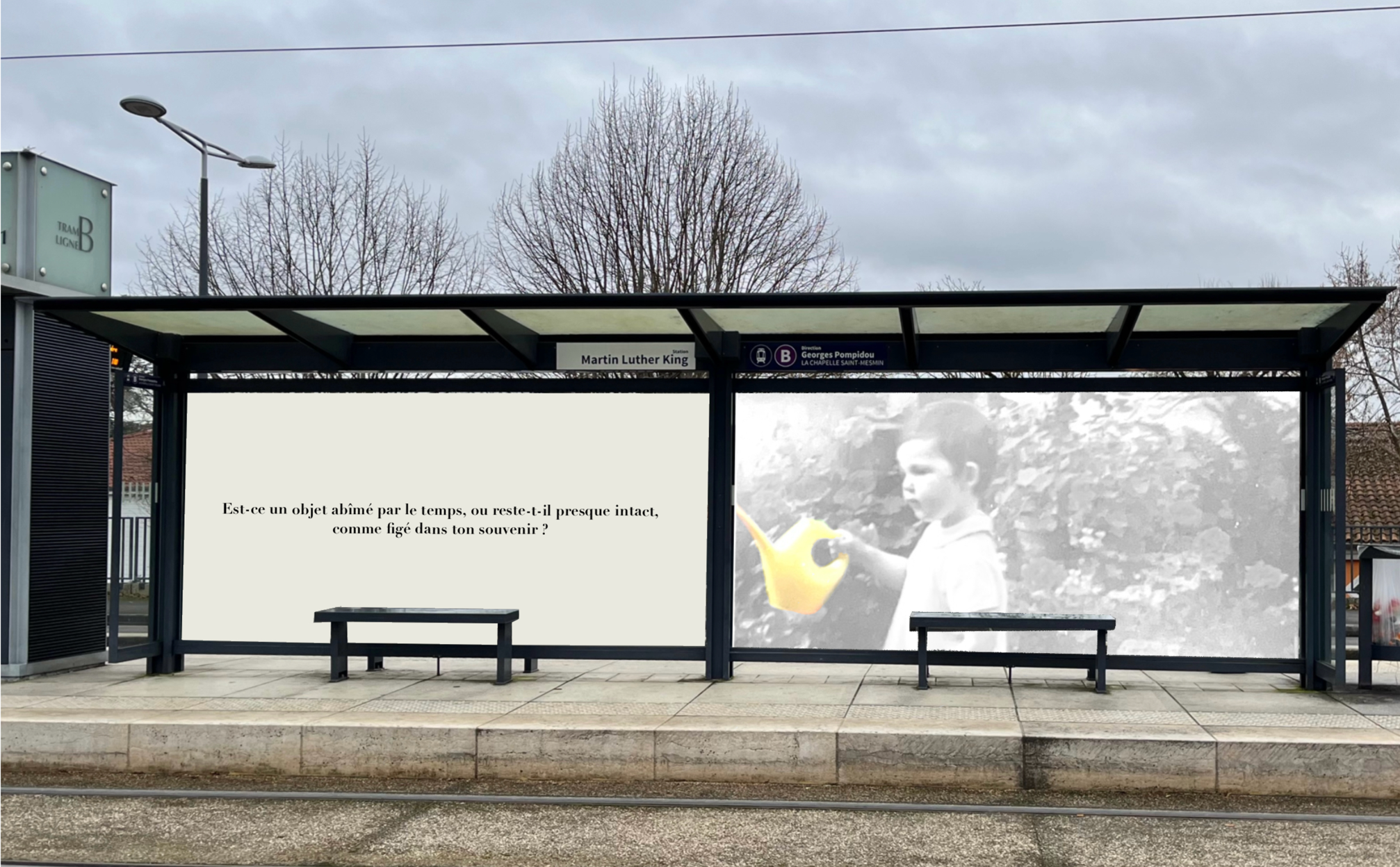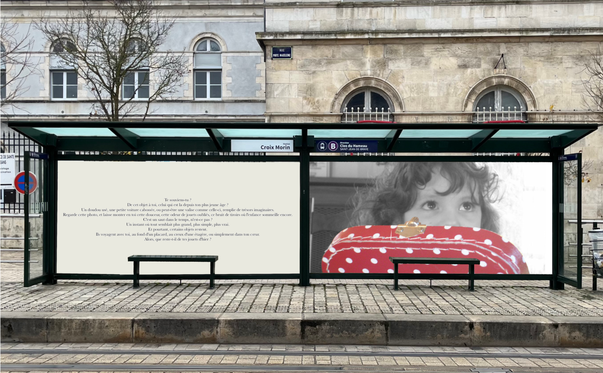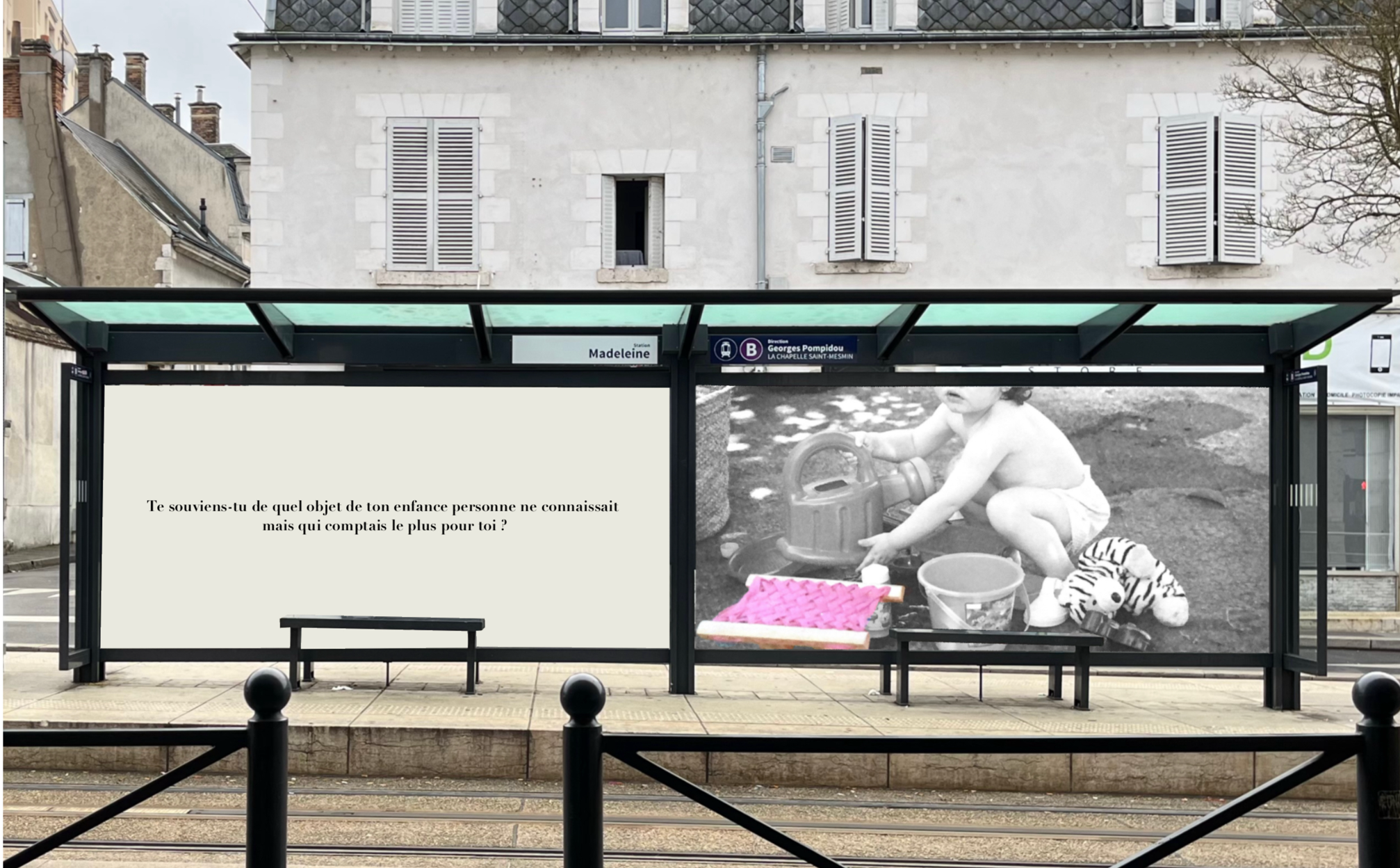 Pensée comme une exposition itinérante, cette scénographie prend place aux arrêts de tramway d'Orléans. À travers des objets d'enfance accompagnés de textes, elle réactive la mémoire intime des passagers et fait de l'attente un instant suspendu, sensible et évocateur.