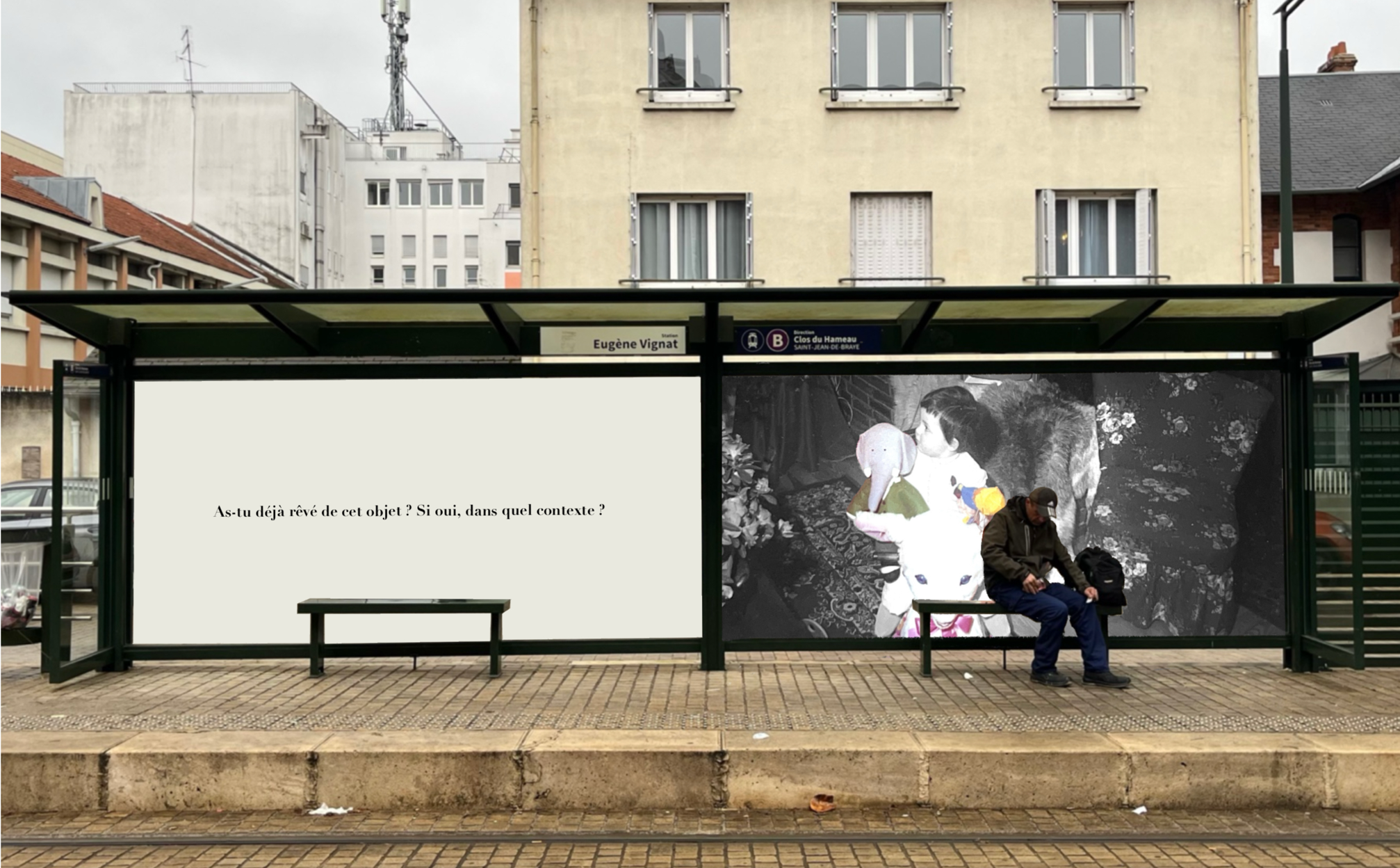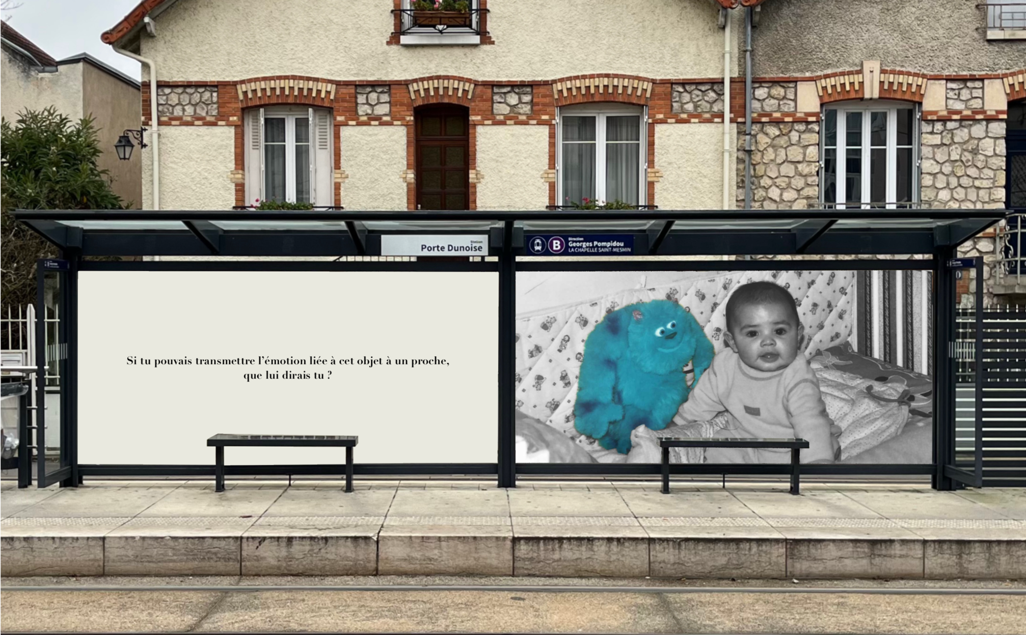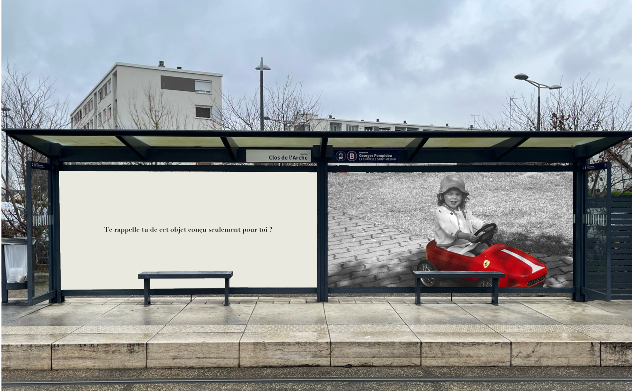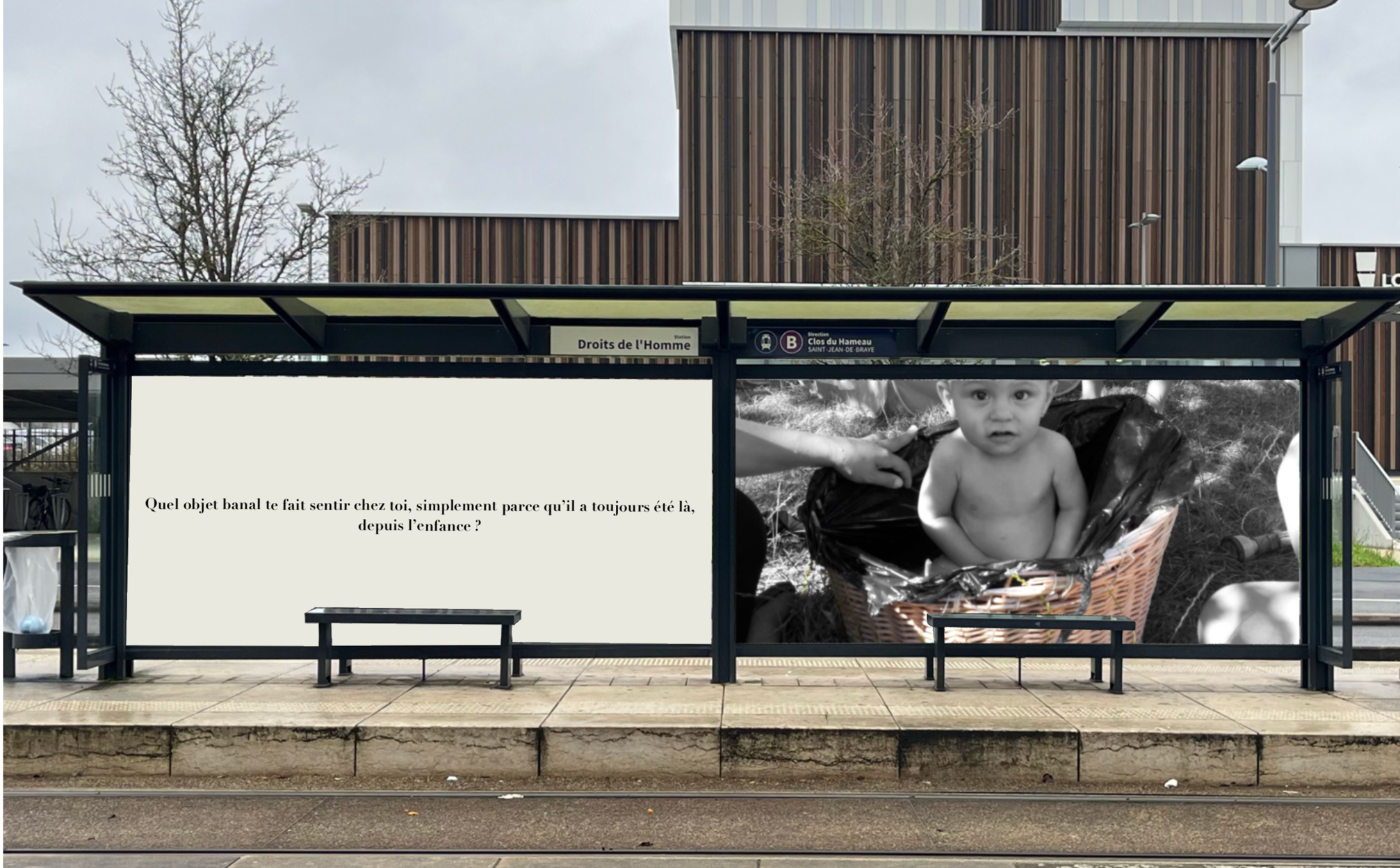 Pensée comme une exposition itinérante, cette scénographie prend place aux arrêts de tramway d'Orléans. À travers des objets d'enfance accompagnés de textes, elle réactive la mémoire intime des passagers et fait de l'attente un instant suspendu, sensible et évocateur.