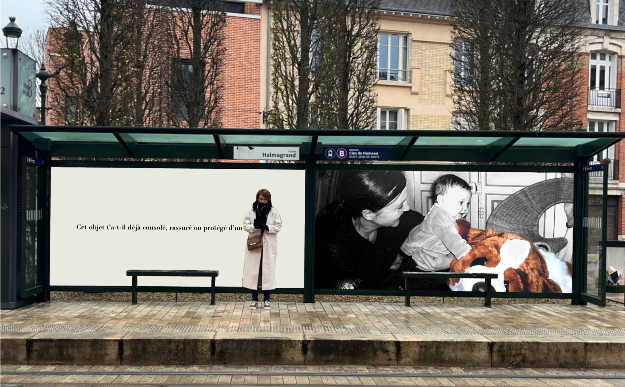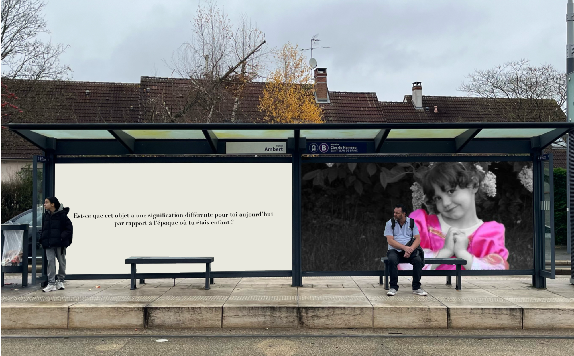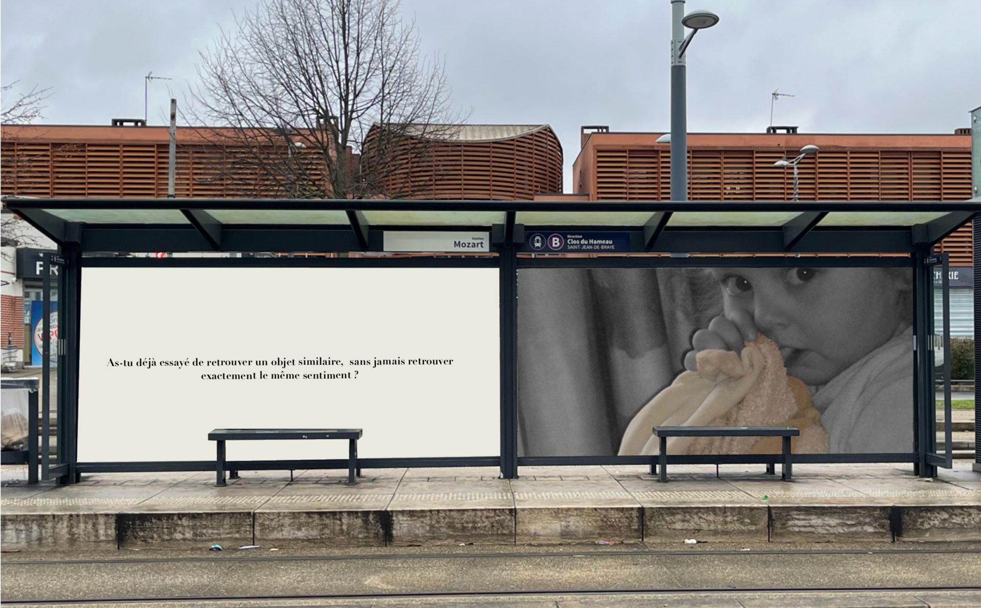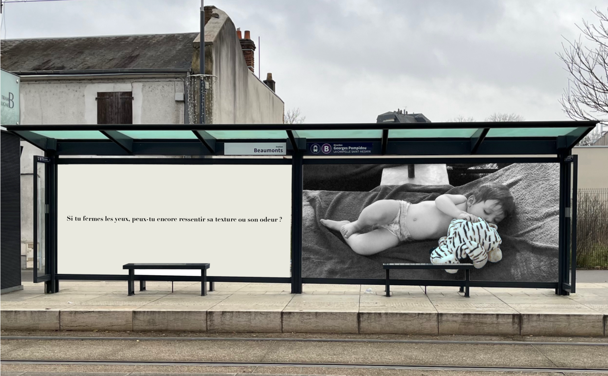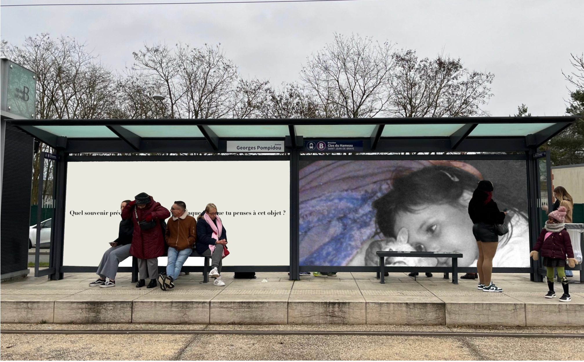 Pensée comme une exposition itinérante, cette scénographie prend place aux arrêts de tramway d'Orléans. À travers des objets d'enfance accompagnés de textes, elle réactive la mémoire intime des passagers et fait de l'attente un instant suspendu, sensible et évocateur.
