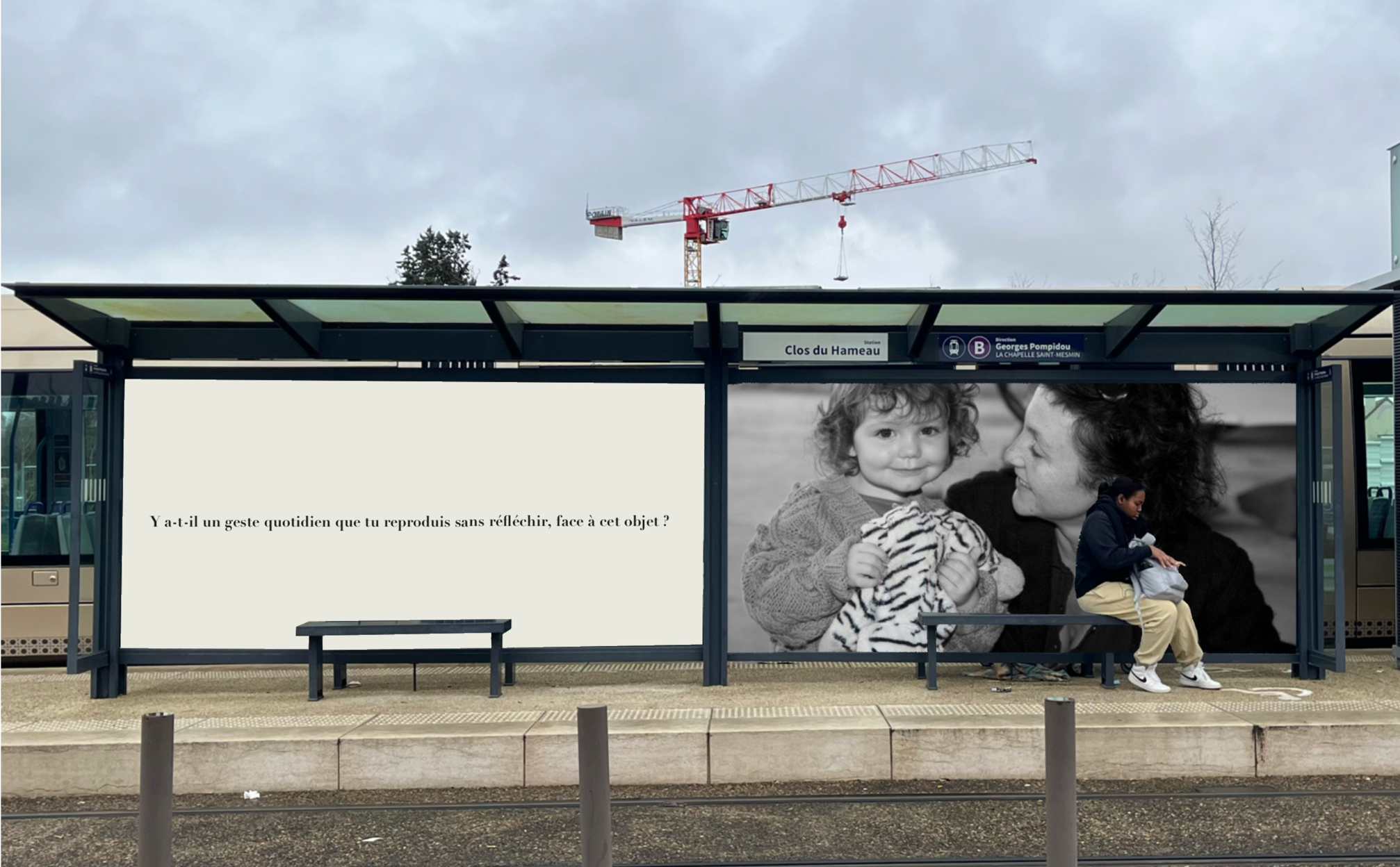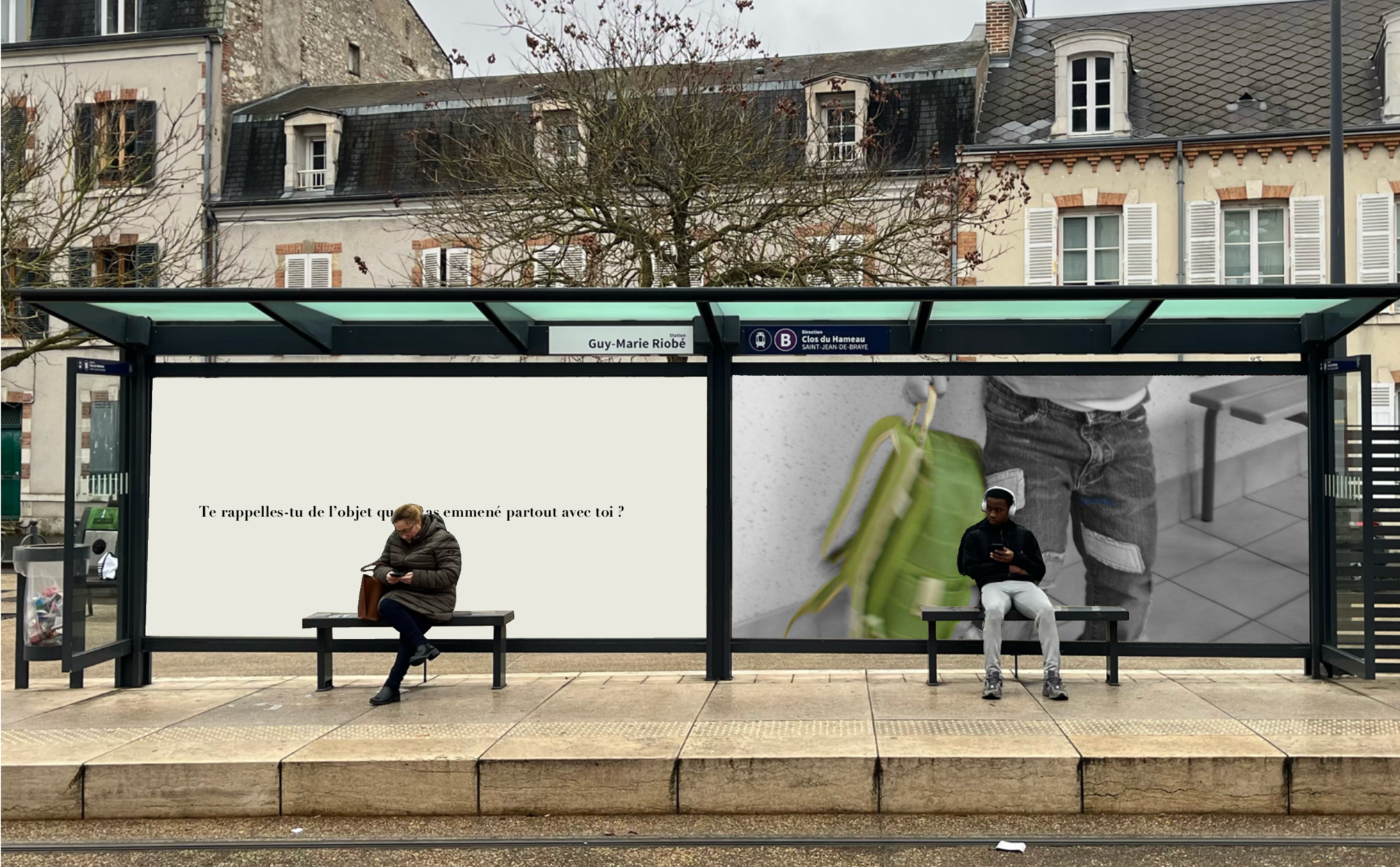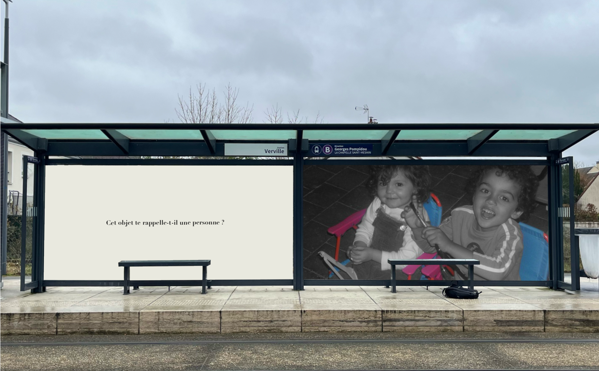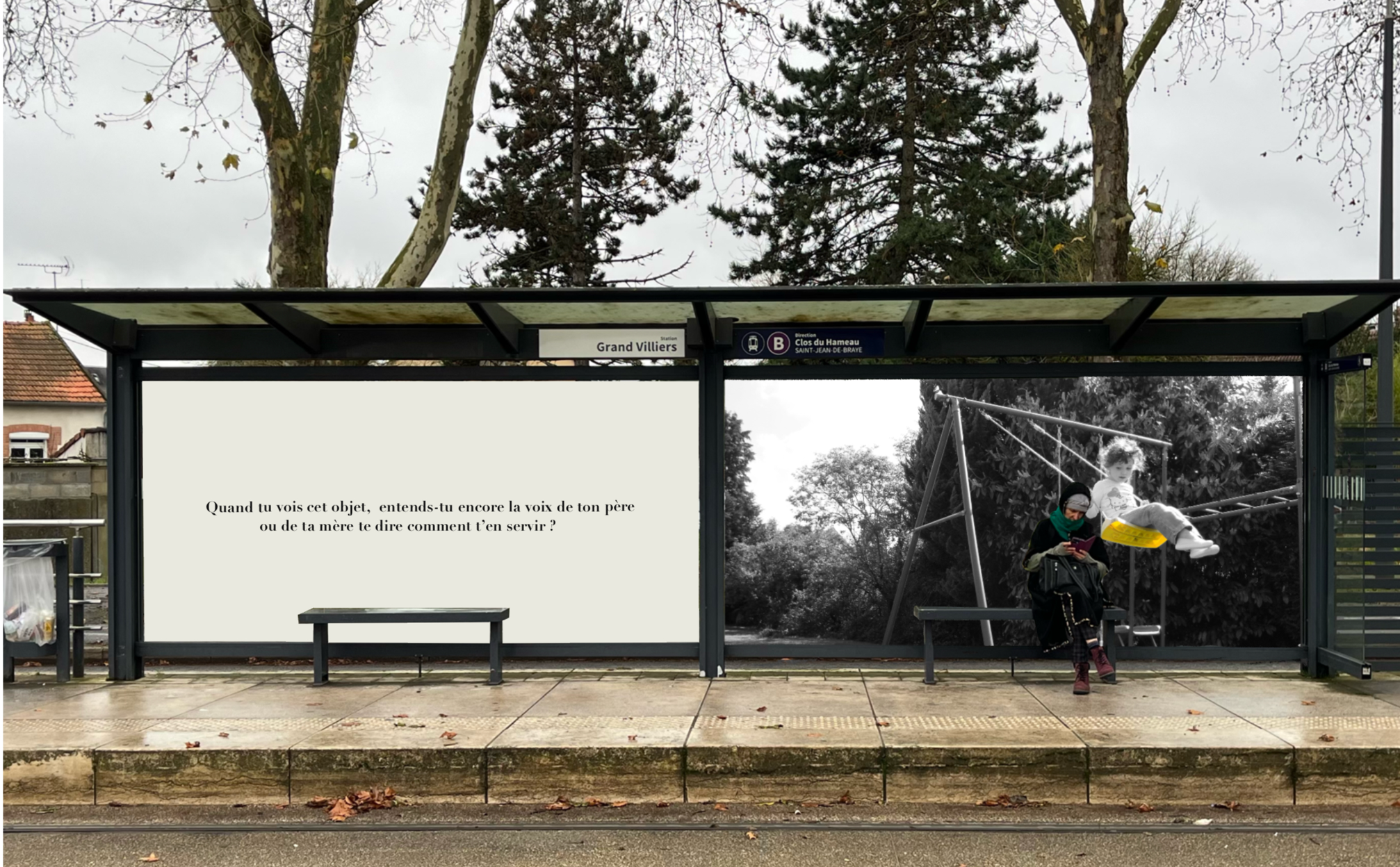 Pensée comme une exposition itinérante, cette scénographie prend place aux arrêts de tramway d'Orléans. À travers des objets d'enfance accompagnés de textes, elle réactive la mémoire intime des passagers et fait de l'attente un instant suspendu, sensible et évocateur.