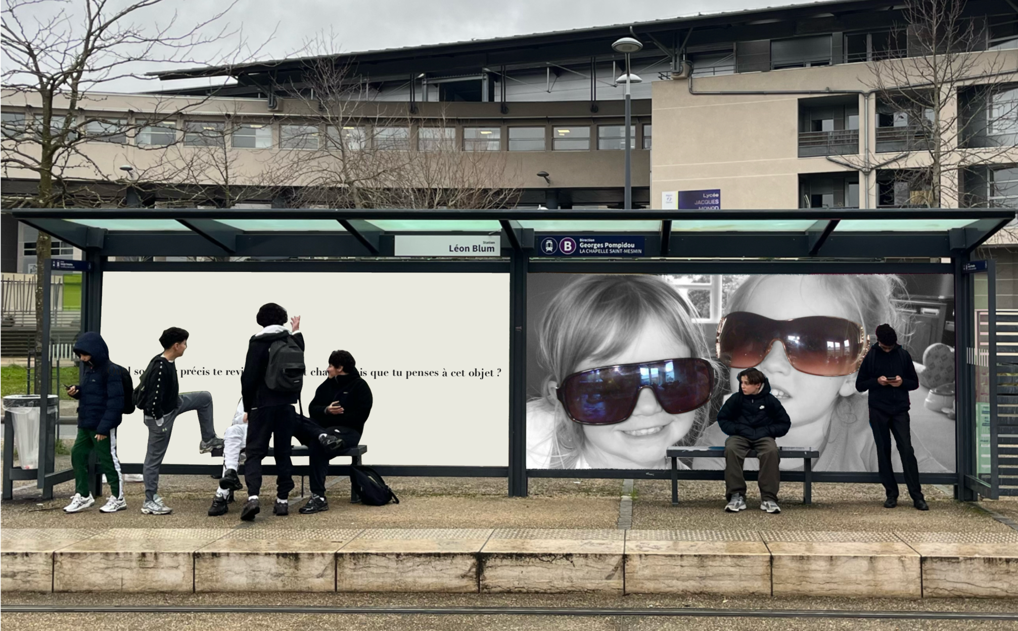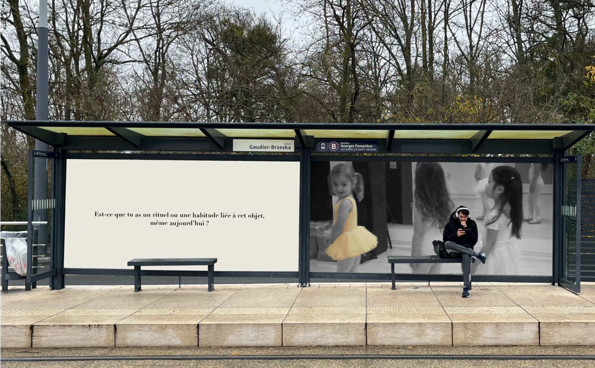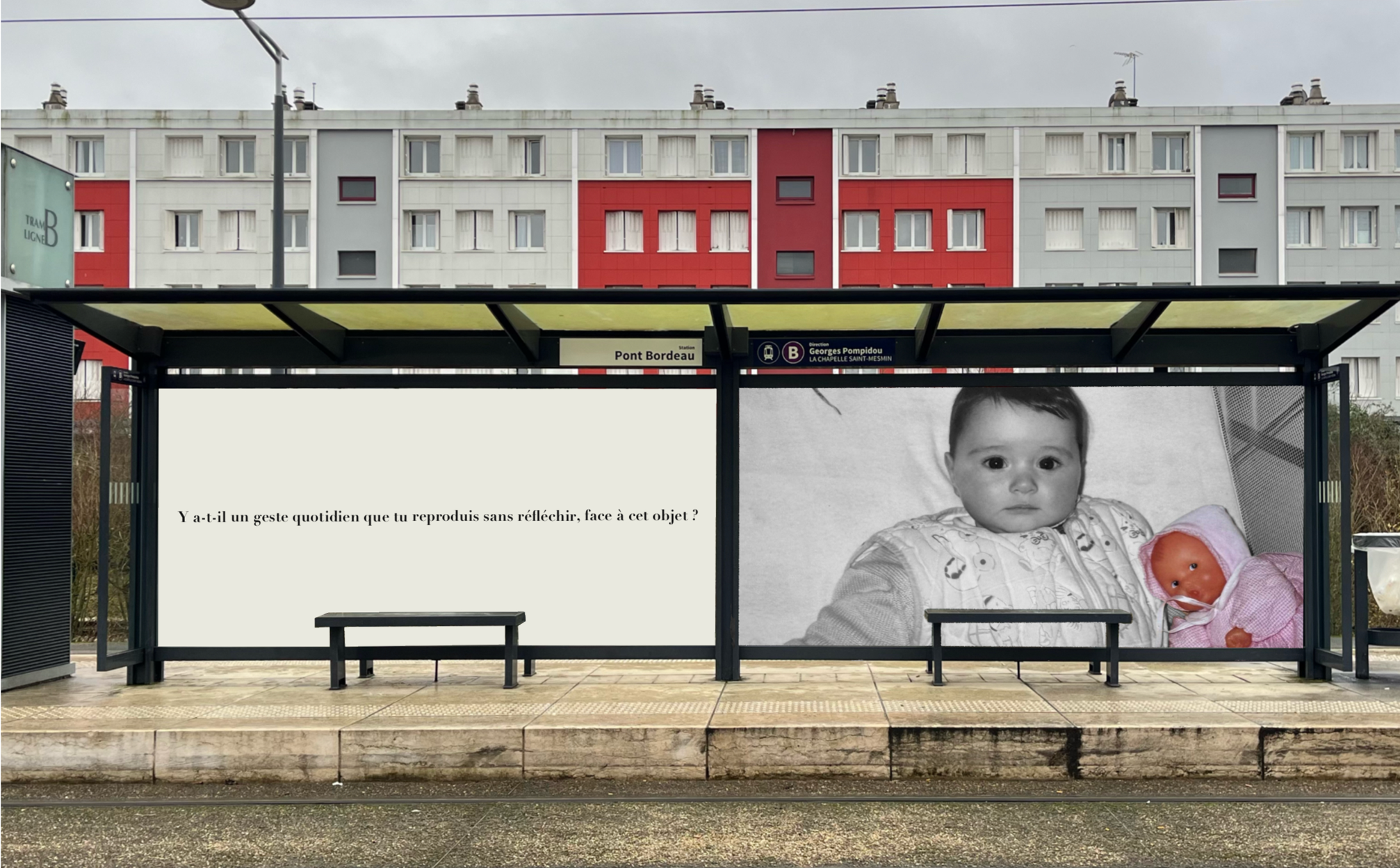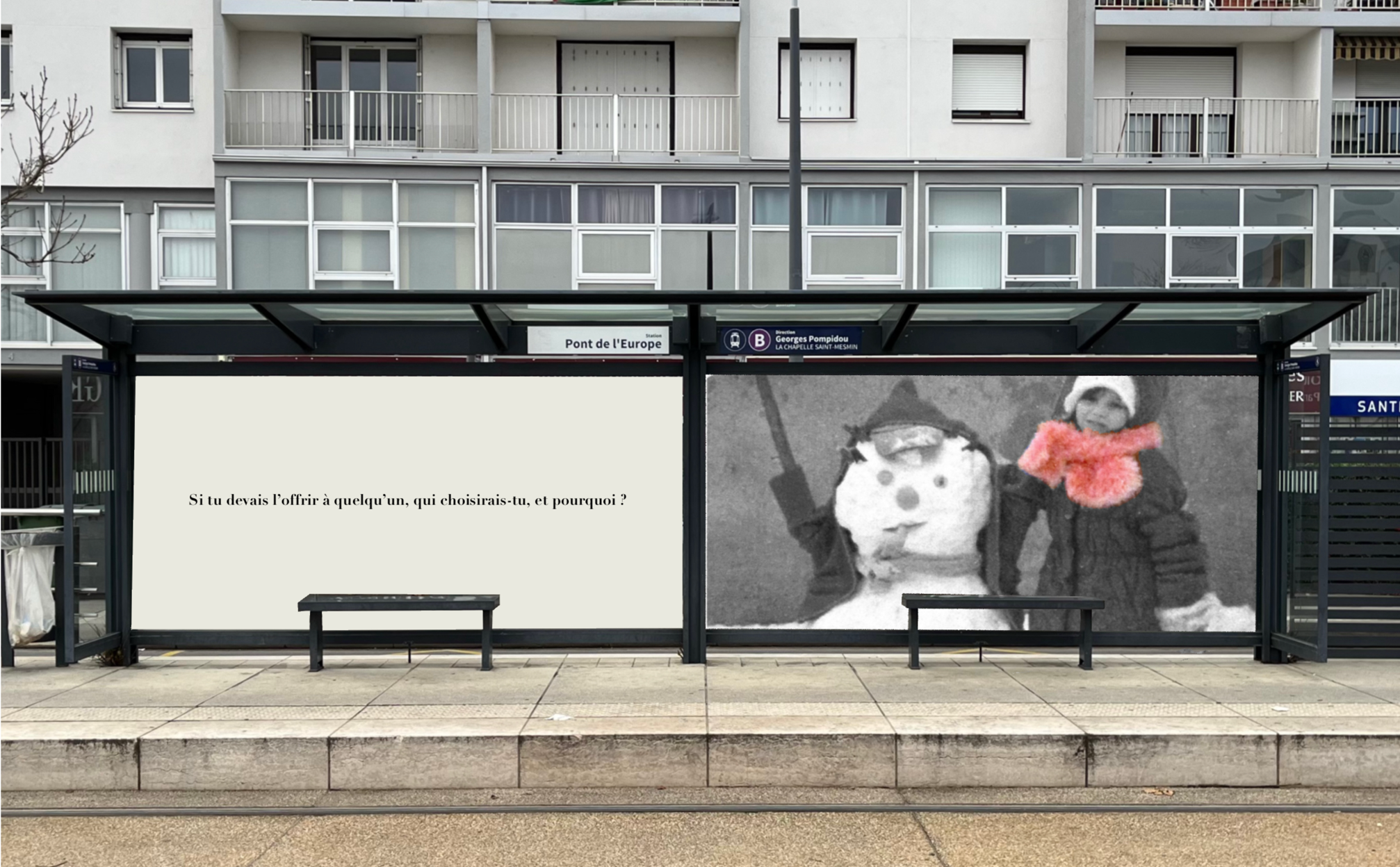 Pensée comme une exposition itinérante, cette scénographie prend place aux arrêts de tramway d'Orléans. À travers des objets d'enfance accompagnés de textes, elle réactive la mémoire intime des passagers et fait de l'attente un instant suspendu, sensible et évocateur.